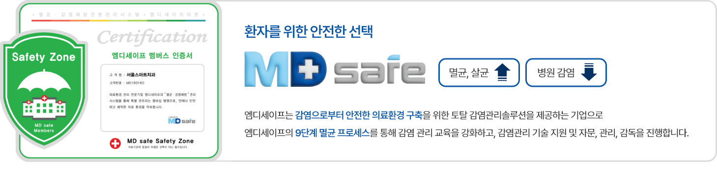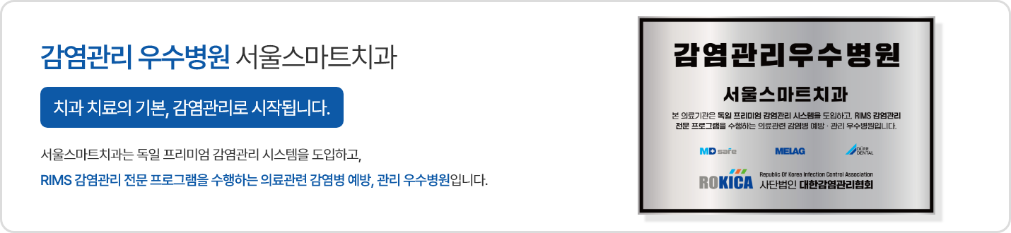 위생, 감염으로 부터 안전한 서울스마트치과는 철저한 소독 시스템을 통해 감염 ZERO 공간을 만듭니다.